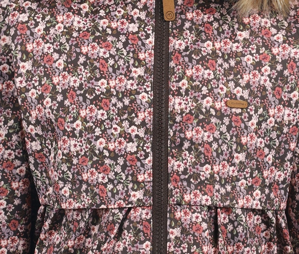 Zauberhafte Mädchen Funktions Outdoorjacke mit Blümchen. Die hübsche Mädchenjacke ist geeignet für alle Wetterlagen und Temperaturen in der kühleren Jahreszeit. Die schöne warme Kapuze hat einen abknöpfbaren Kunstpelzbesatz. Markenware von Minymo – der hochwertigen Trendmarke aus Dänemark.