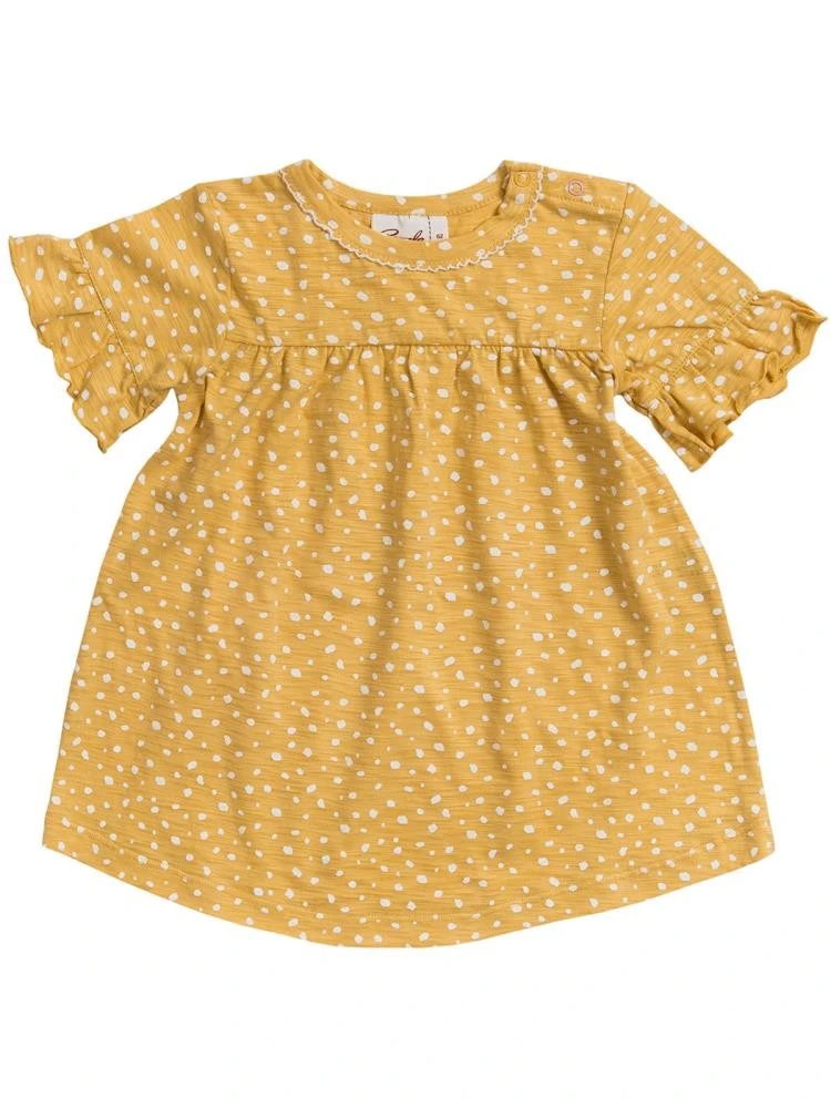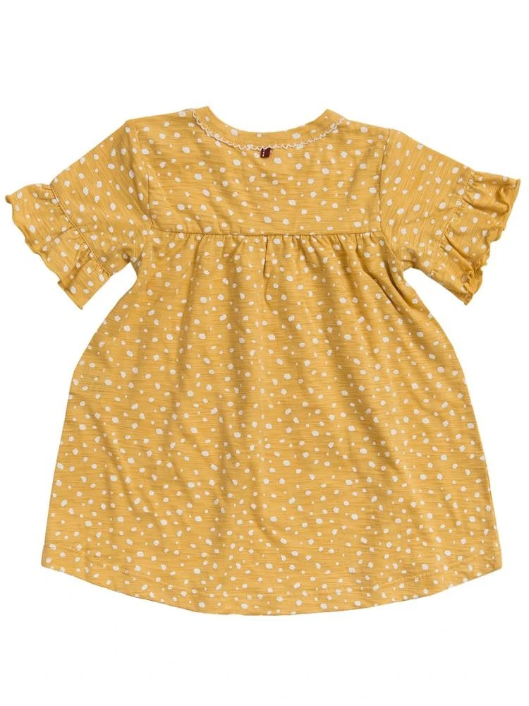 Hübsches Jersey Mädchenkleid in maisgelb mit dezenten Pünktchen. Das Material ist 100% Baumwolle , kontrolliert biologischer Anbau, „organic“ gem. GOTS lizenziert durch Ecocert Greenlife | Liz. Nr. 151811. Hergestellt aus Bio-Baumwolle .