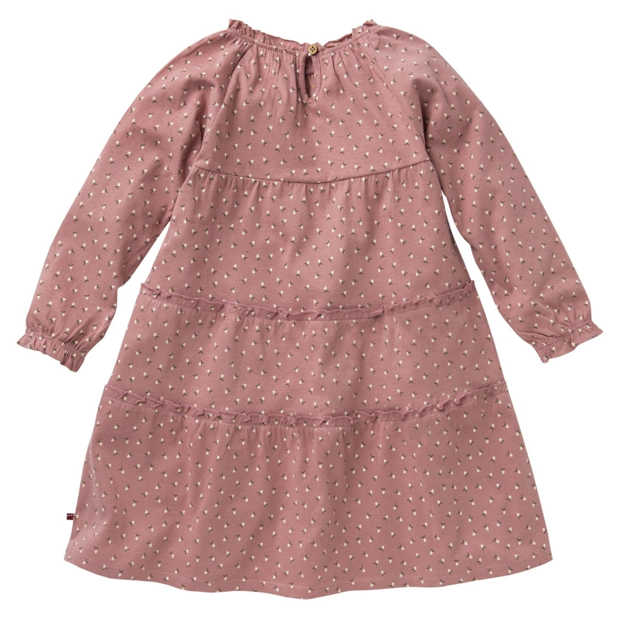 Schwungvolles Langarmkleid für Mädchen. Der weiche Baumwolljersey-Stoff hat schöne Stufen-Volants. Der bequeme Schnitt engt nicht ein und gibt viel Bewegungsspielraum. Für leichtes An- und Ausziehen, ist im Nacken ein Knopfverschluß angebracht. Ein schickes Stufen-Kleidchen aus Bio-Baumwolle, das beim hüpfen und drehen schön schwingt.