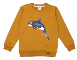 Bequemes Walkiddy Sweati in curry mit hübschem Orca-Motiv. Die Walprofis erkennen sicher sofort den schnellen Schwertwal aus der Familie der Zahnwale. Orcas sind die größten Delfine, die es gibt. Sie können bis zu 7 Mater lang werden. Das Material ist Bio-Baumwolle , kontrolliert biologischer Anbau, „Organic“ gem. GOTS lizenziert ( Liz. Nr. USB TEX2729)